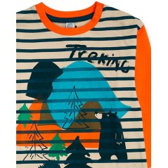 Camiseta de punto, de color naranja con estampado de montaña y rayas para niño. Colección Trecking Time.